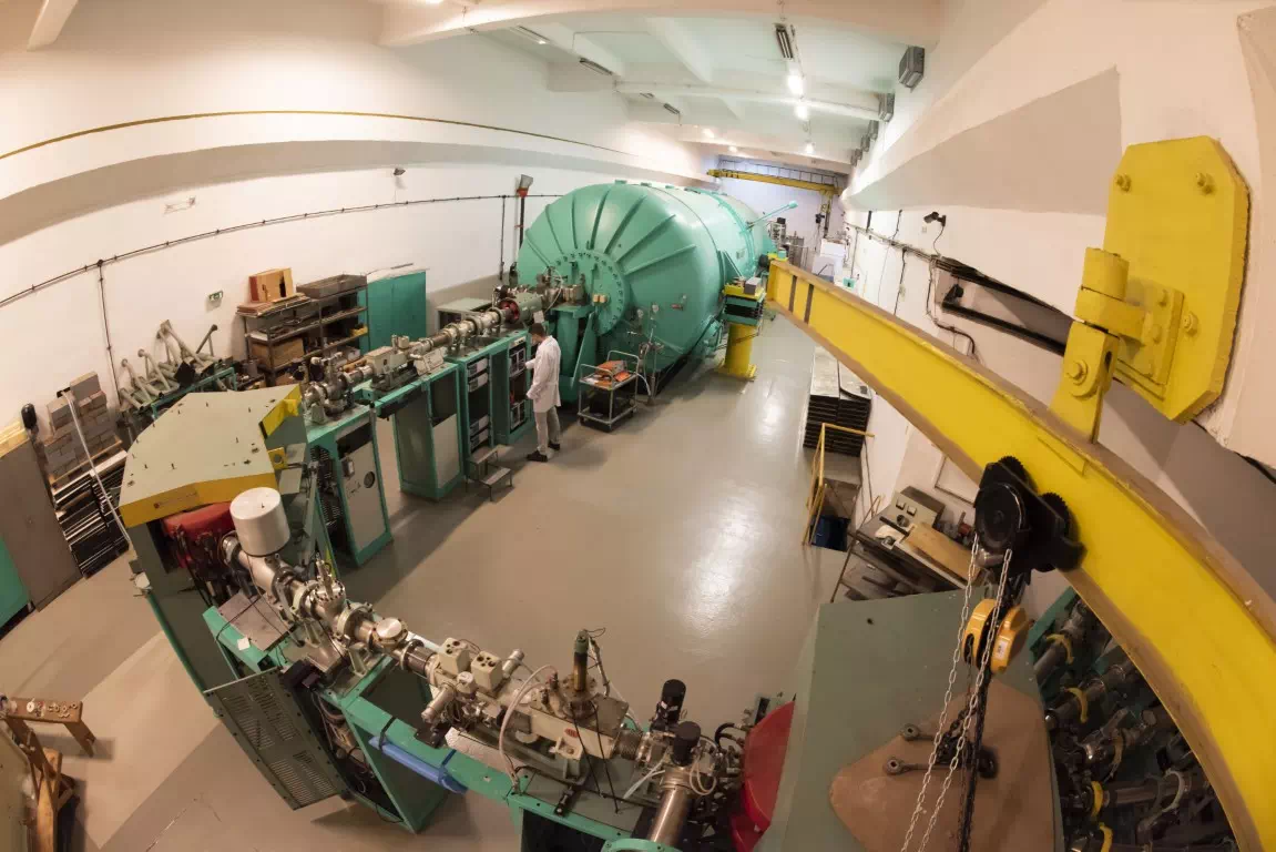 The 9 MV FN Pelletron Tandem Accelerator, operated by the Horia Hulubei National Institute for R&D in Physics and Nuclear Engineering (IFIN-HH) in Magurele, Romania, is a versatile high-voltage particle accelerator used for advanced nuclear and interdisciplinary research. The accelerator uses the tandem principle: it begins by generating negative ions using sputtering or duoplasmatron ion sources. These ions are accelerated toward a high-voltage terminal charged at +9 MV. Inside the terminal, a thin carbon foil removes electrons from the ions, converting them into positive ions, which are then accelerated away from the terminal. This two-stage acceleration process enables the delivery of high-energy, multi-charged ion beams with excellent energy stability and a resolution as low as 1-2 keV. The beam can be directed on one of the 7 beam lines depending on the aim of the experiment.
